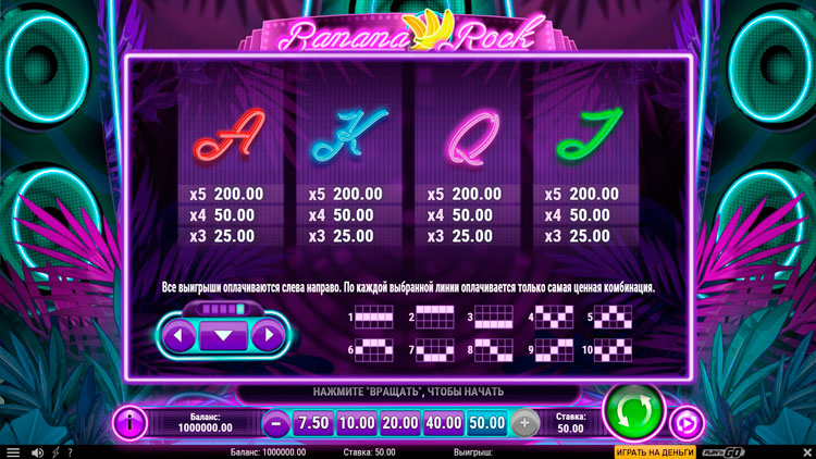 Таблица выплат Banana Rock