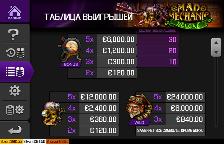 Таблица выплат Mad Mechanic Deluxe