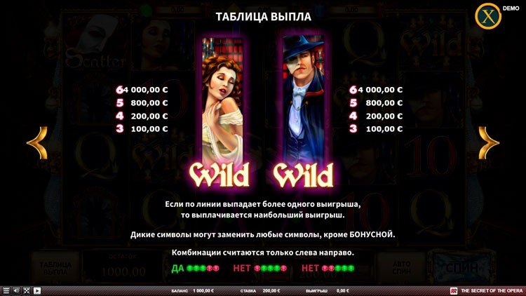 Таблица выплат The Secret of the Opera