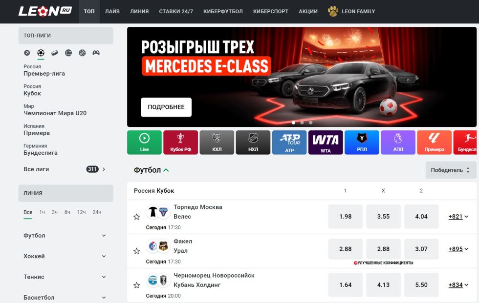 Благодаря низкому порогу входа (от 100 ₽), приветственному фрибету и понятному интерфейсу, Леон можно рекомендовать новичкам.