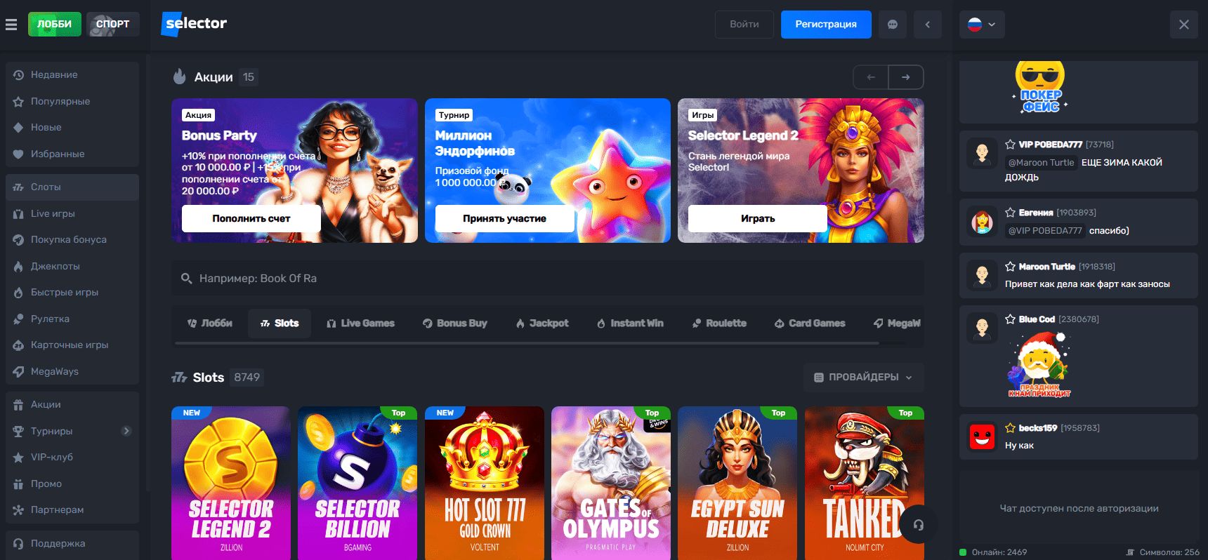 Регистрация в Selector Casino